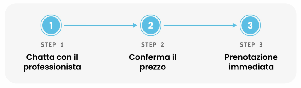 Segui passo passo il flusso: scegli, chatta, prenota e paga solo a lavoro finito.